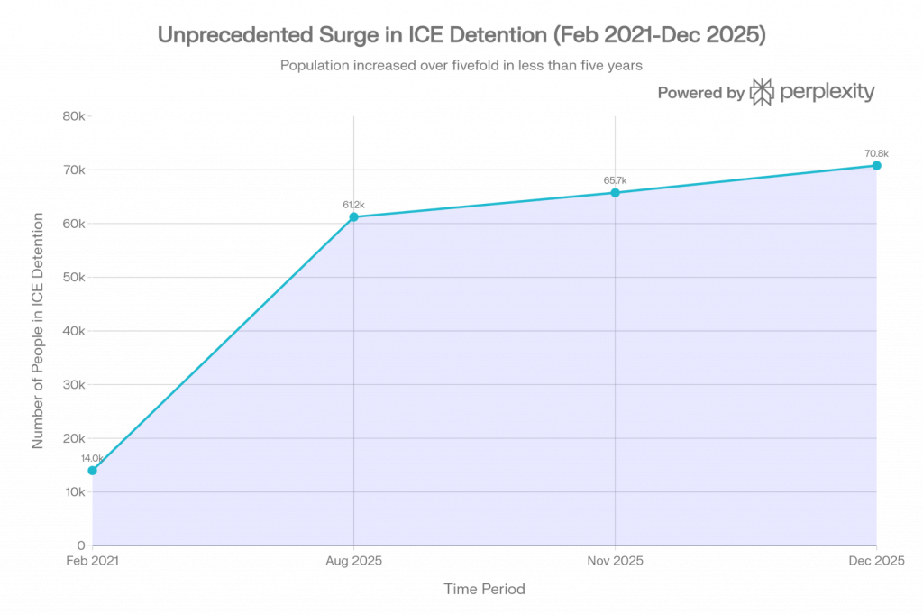 - ICE detention population surge illustrating the five-fold increase from February 2021 through December 2025