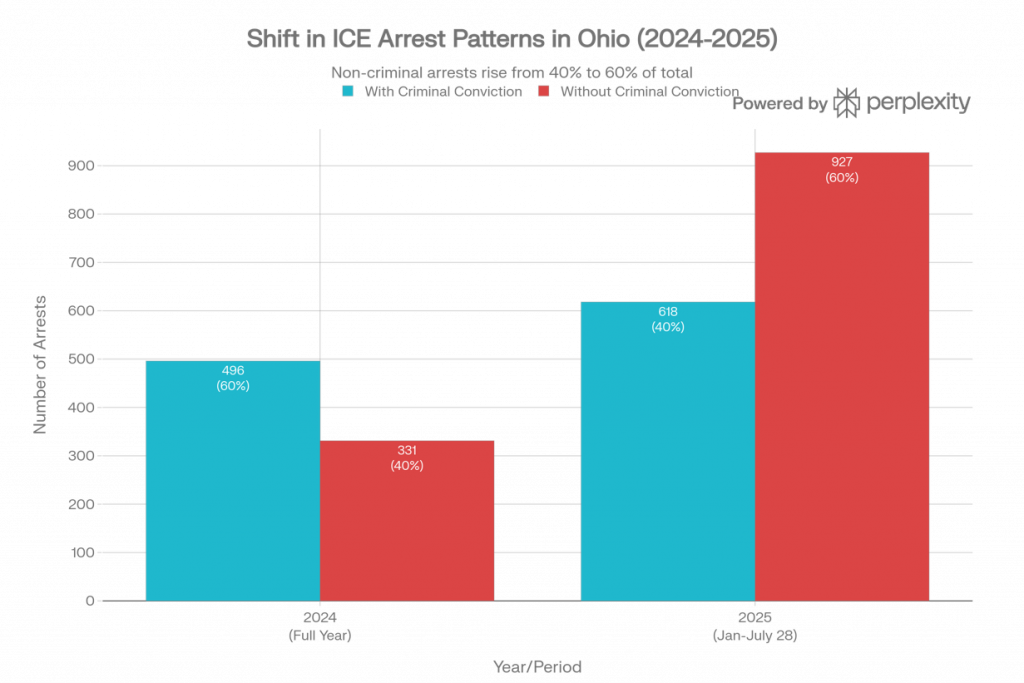 Ohio illustrates this policy shift in granular detail. Through July 28, 2025, ICE apprehended 1,546 individuals in Ohio—an 87% increase from the 828 arrested during all of 2024. Critically, the composition of arrests reversed: In the first half of 2024 under Biden, 60% of Ohio ICE arrests involved people with criminal convictions; in the first half of 2025, only 40% involved criminal convictions. By June 2025, approximately 50% of daily ICE arrests in Ohio involved individuals without criminal charges or convictions—up from 29% in May, immediately following the quota increase.