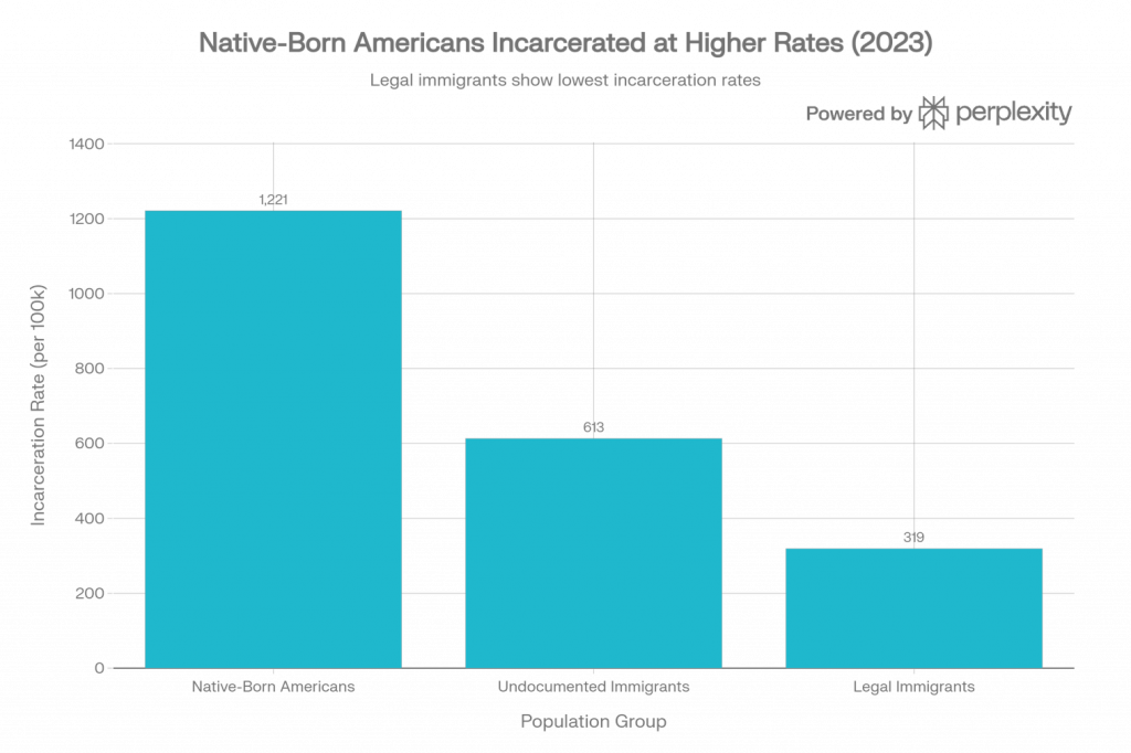 The data are unambiguous. In 2023, the incarceration rate for native-born Americans was 1,221 per 100,000 population—the highest among all demographic groups examined. Undocumented immigrants, by contrast, were incarcerated at 613 per 100,000 (50% lower), while legal immigrants experienced the lowest rate at just 319 per 100,000 (74% lower than native-born). This disparity has persisted for 150 years without exception: historians have found no period in American history when immigrants’ incarceration rates exceeded those of the native-born.