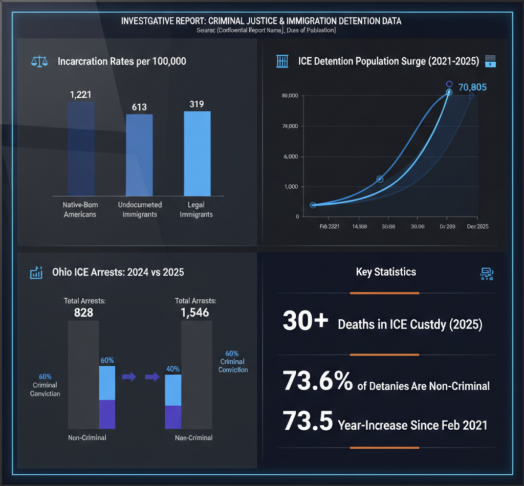 The United States operates two parallel detention systems with starkly different constitutional protections, accountability mechanisms, and algorithmic governance frameworks—one nominally bound by criminal justice due process protections, the other increasingly insulated from them. An investigative analysis of immigration detention, criminal justice algorithmic risk assessment, and state-level enforcement patterns reveals a system fracturing along multiple fault lines: immigrants (both documented and undocumented) commit crimes at substantially lower rates than native-born Americans, yet face detention at unprecedented scale and duration under non-transparent algorithmic systems that lack adversarial challenge mechanisms. Simultaneously, artificial intelligence tools embedded in criminal courts—particularly risk assessment algorithms—perpetuate and amplify racial biases while operating largely outside public scrutiny. In Ohio specifically, the surge in ICE enforcement has shifted from targeting individuals with criminal histories to mass detention of noncriminal populations, while the state’s ORAS algorithmic risk assessment system raises due process concerns despite judicial comfort with its use.