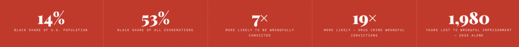 There is a number that should shake every courthouse in America to its foundation. Black people make up roughly 14 percent of this country’s population. And yet they account for 53 percent of every known exoneration since 1989 — meaning more than half the people this nation has wrongfully convicted, imprisoned, and later admitted it got wrong, are Black Americans.