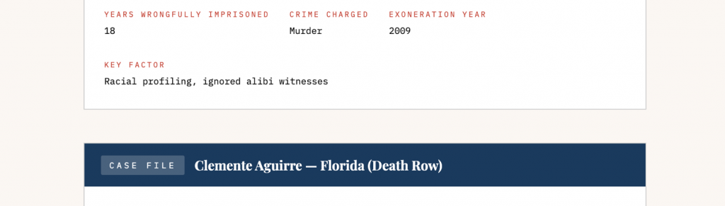Clemente Aguirre, a Honduran immigrant, was convicted of murder and sentenced to death in Florida. He spent 14 years in prison — including a decade on death row — before being exonerated by DNA evidence in 2018. Despite his exoneration, Florida’s compensation law left him with no financial remedy for the years stolen from his life.