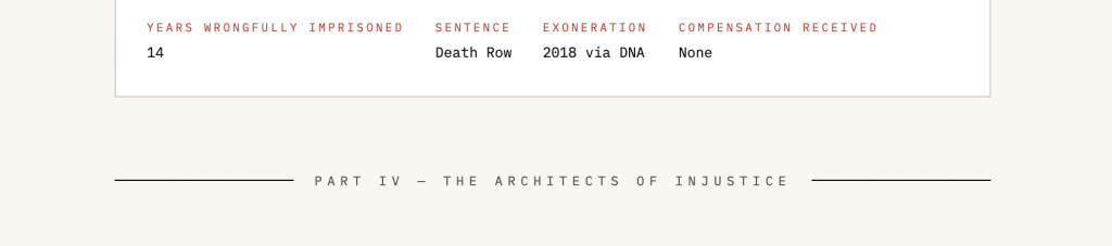 Behind every data point in this investigation is a face, a name, a family, a community. Anthony Ray Hinton — 30 years on Alabama’s death row for a crime he did not commit. Marvin Anderson — 20 years for a sexual assault he never committed, identified by a victim because he was “the only Black man in town with a white girlfriend.” The 200-plus residents of Chicago’s Ida B. Wells development who were framed by Ronald Watts because they were poor, Black, and had no one powerful enough to believe them.