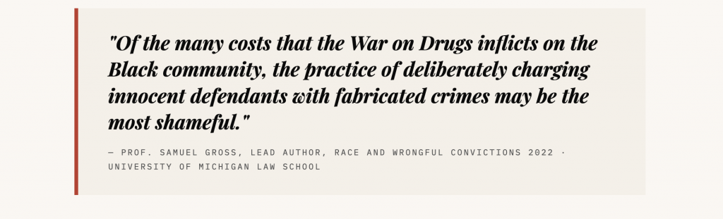 The drug crime numbers are especially damning because they expose the lie at the center of the War on Drugs. Black and white Americans use illegal substances at similar rates. And yet 69 percent of all drug crime exonerees are Black, while only 16 percent are white. The disparity is not about behavior. It is about who gets watched, who gets stopped, and who gets framed.